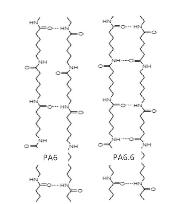 PA6由己內酰胺開環再聚合,PA66由己二胺和己二酸聚合而成。二者分子鏈中都含有如下的酰胺基團結構: